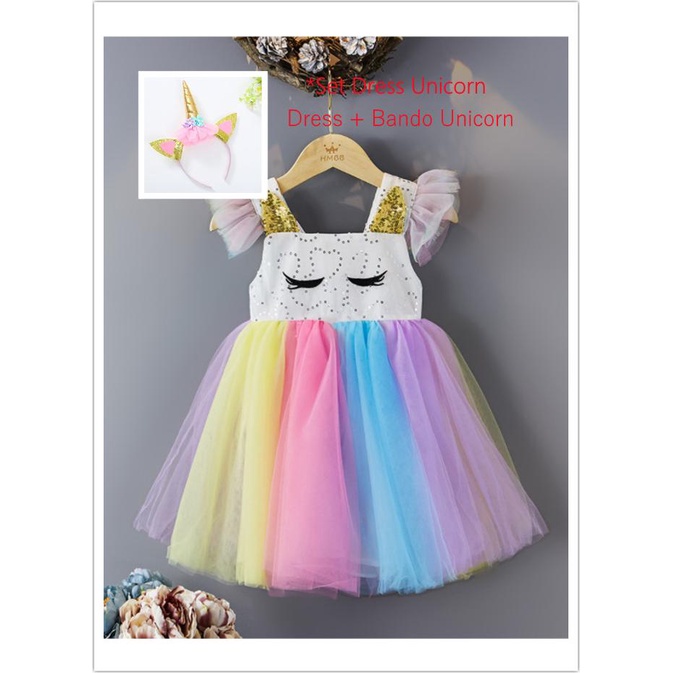 Unicorn dress anak kartun lucu pelangi gaun princess cewek gadis.